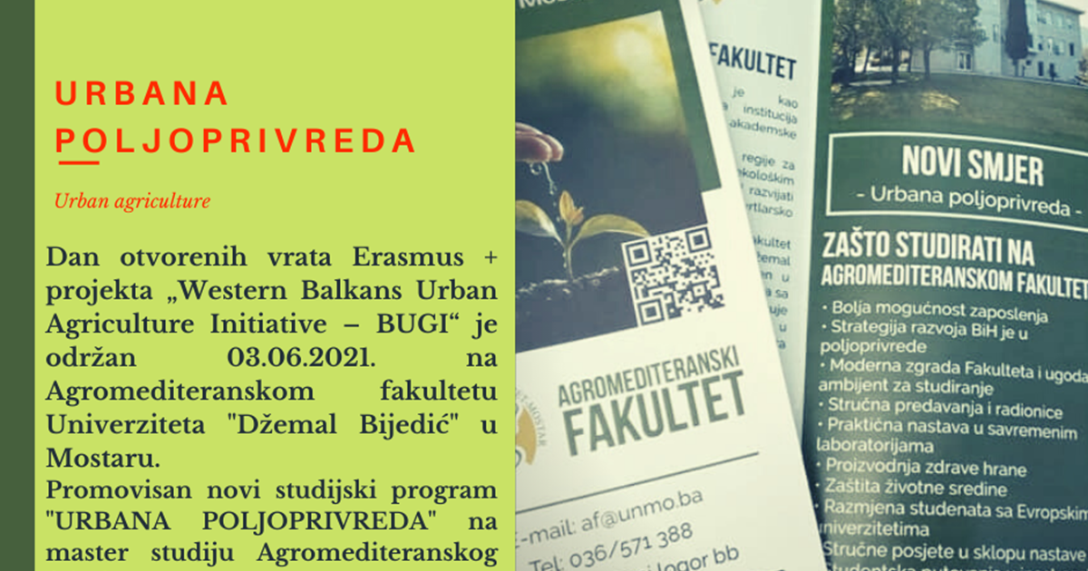 Dan otvorenih vrata Erasmus + projekta „Western Balkans Urban Agriculture Initiative – BUGI“ je održan 03.6.2021. na Agromeiteranskom fakultetu Univerziteta "Džemal Bijedić" u Mostaru Planom promocije budući studenti su nakratko posjetili prostorije i laboratorije Fakulteta. Budućim studentima je naročito zanimljiva bila posjeta staklenika u kojem se nalazi oprema za hidropon ...