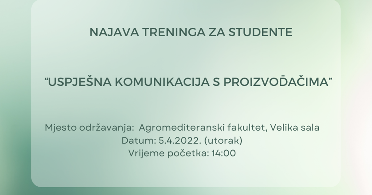 NAJAVA TRENINGA ZA STUDENTE - “USPJEŠNA KOMUNIKACIJA S PROIZVOĐAČIMA”