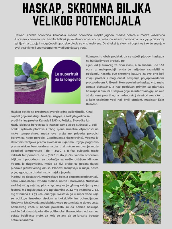 Haskap, Siberian blueberry, Kamchatka, honey blueberry, May strawberry, honey berry or blue goat's blood ( Lonicera caerulea var. Kamtschatica ) is a relatively new fruit species in our area, whose production, cultivation requirements and the possibility of using the fruit are very little known. This text is a modest contribution to spreading knowledge about this attractive and very resistant type of berry.