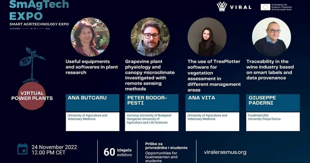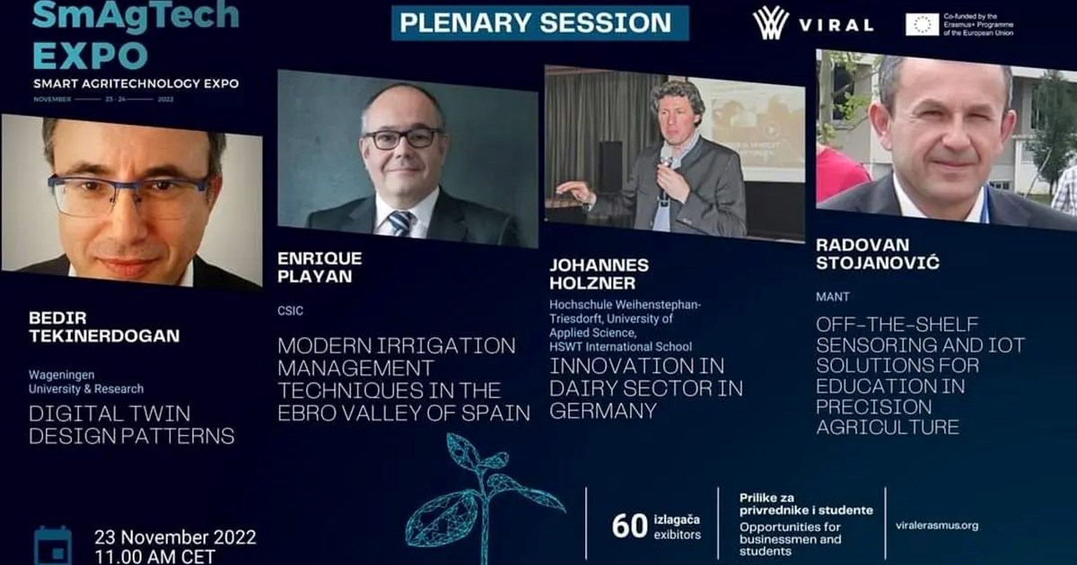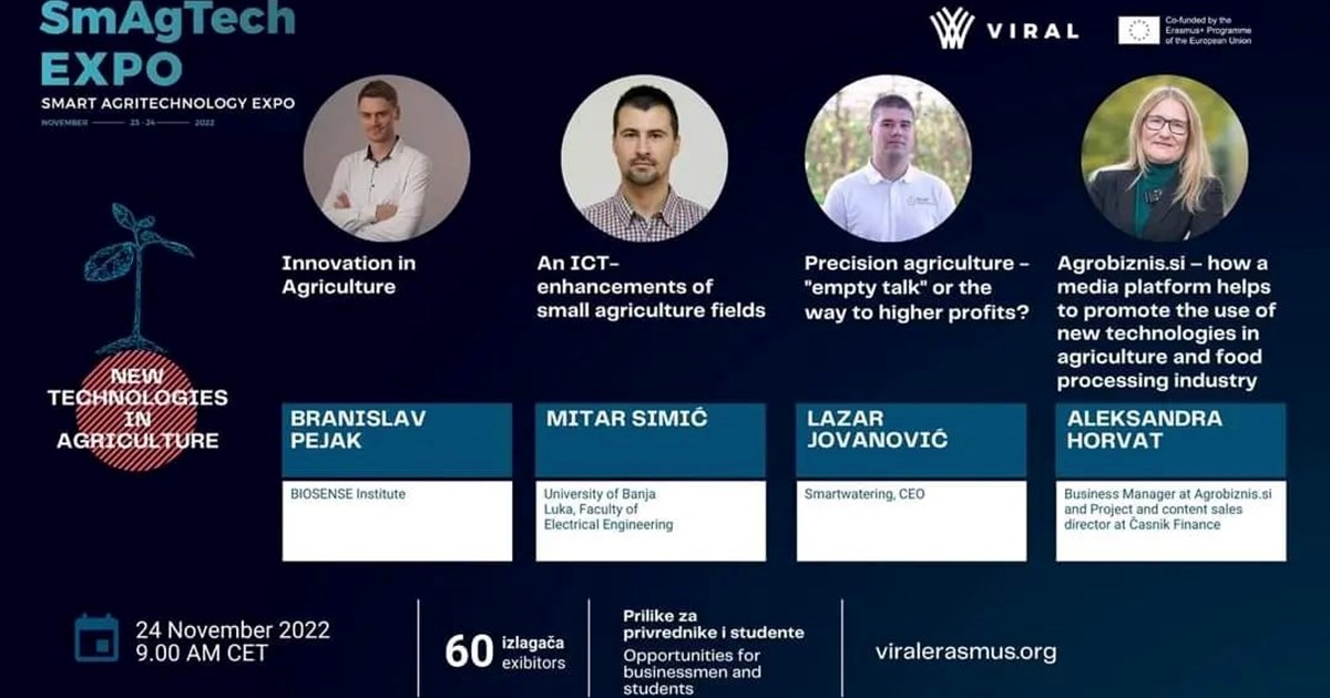 Drugi virtuelni sajam SmAgTech EXPO ove godine se organizuje 23-24.11.2022. godine. Ukoliko želite da saznate više o stanju i perpsektivama IKT u poljoprivredi, digitalizaciji u animalnoj proizvodnji, daljinskoj kontroli procesa proizvodnj ili mogućnosti koje nove tehnologije nude u biljnoj proizvodnji, pozivamo vas da prisustvujete stručnim sekcijama tokom sajma.