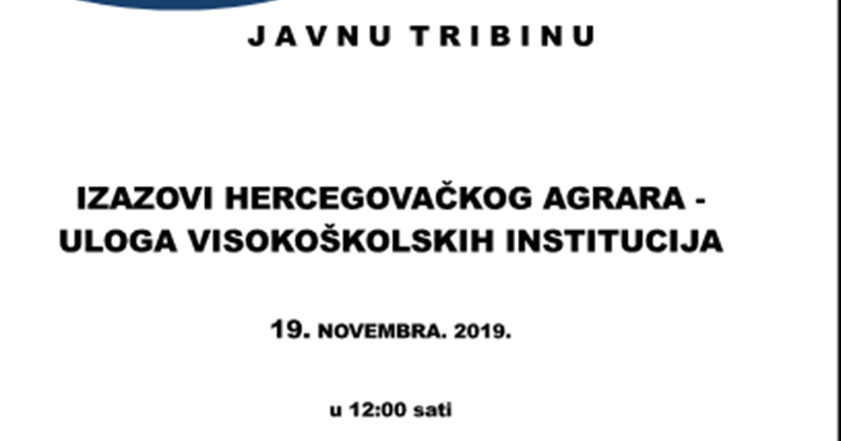 JAVNA TRIBINA „IZAZOVI AGRARA – ULOGA VISOKOŠKOLSKIH INSTITUCIJA“ Čast nam je i zadovoljstvo pozvati vas na javnu tribinu koju organizuje Agromediteranski fakultet Univerziteta “Džemal Bijedić” u Mostaru. Tribina će biti održana u utorak 19. novembra 2019. godine u 12:00 sati.u prostorijama Agromediteranskog fakulteta (Univerzitetski kampus, Mostar). ...