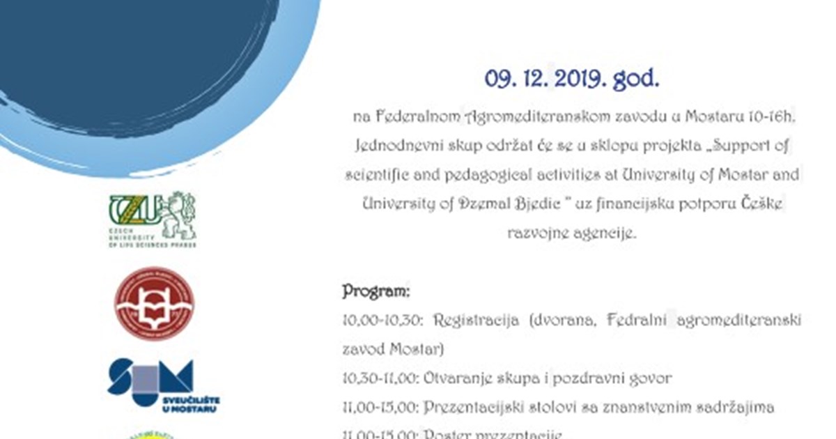 Češki Univerzitet prirodnih nauka iz Praga zajedno sa Agronomskim i prehrambeno-tehnološkim fakultetom Sveučilišta u Mostaru i Agromediteranskim fakultetom Univerziteta „Dzemal Bijedić“ u Mostaru organizuju Naučni dan 09. 12. 2019. god. na Federalnom agromediteranskom zavodu u Mostaru u periodu 10-16h. Posjetioci će imati priliku da im naši studenti pokažu, kako se izoluje DNK ...