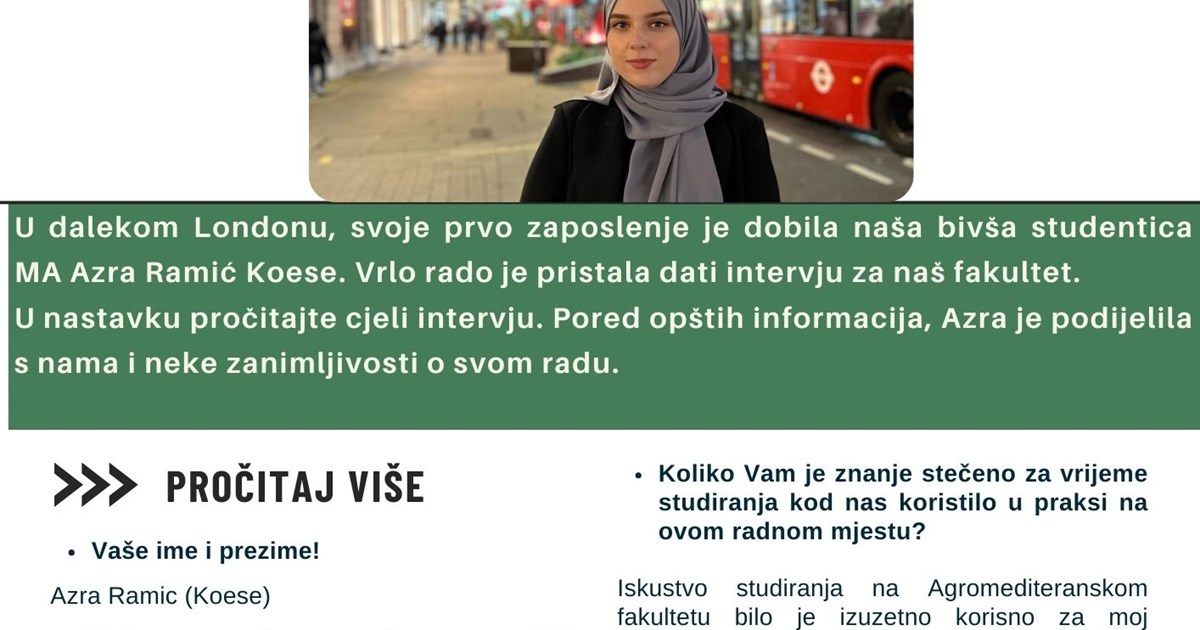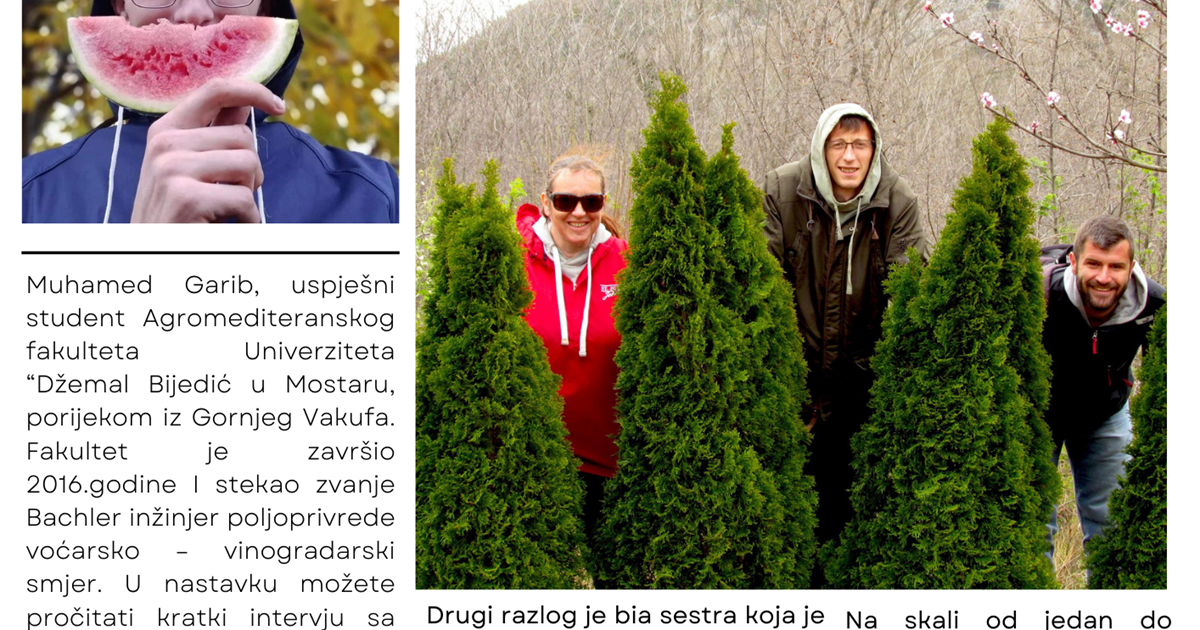 Nastavljamo pozitivne priče o studentima našeg Fakulteta. Muhamed Garib je uspješni student Agromediteranskog fakulteta Univerziteta “Džemal Bijedić u Mostaru, porijekom iz Gornjeg Vakufa. Živi i radi u Mostaru. Fakultet je završio 2016.godine i stekao zvanje Bachelor inžinjer poljoprivrede voćarsko – vinogradarski smjer. U nastavku možete pročitati kratki intervju sa ...