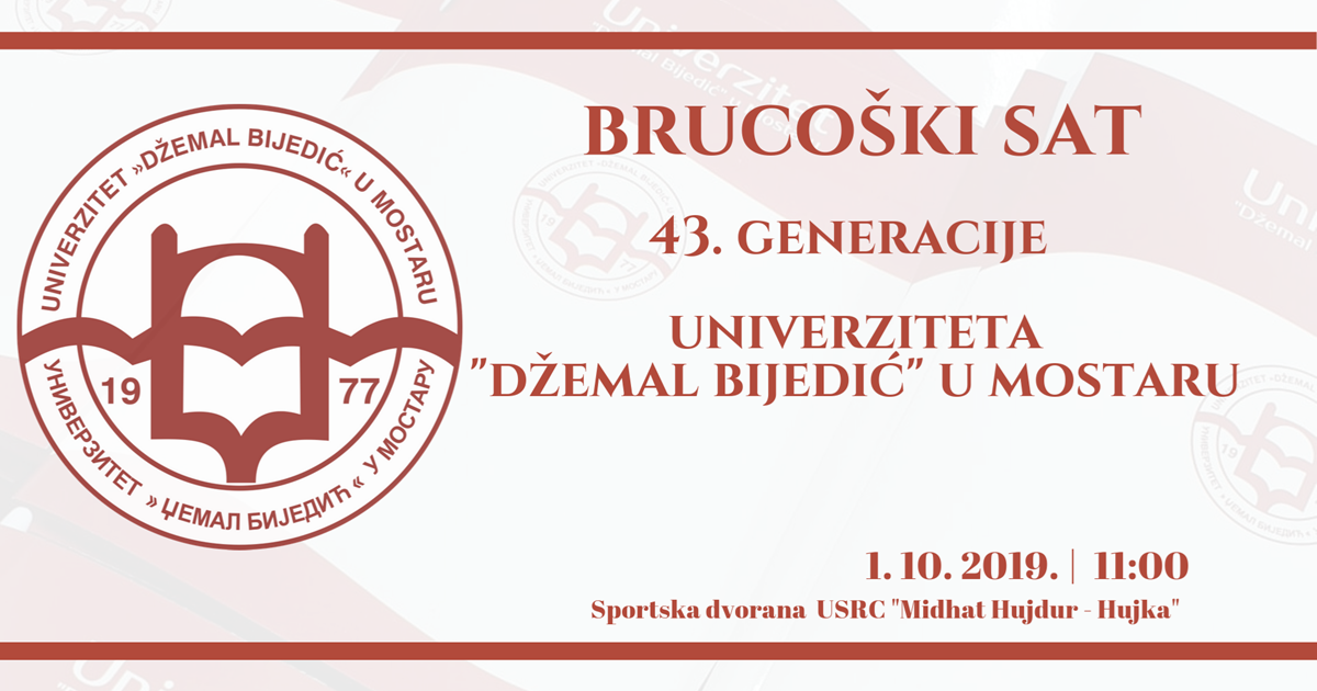 Danas, 1. 10. 2019. godine na Univerzitetu „Džemal Bijedić“ u Mostaru održan je Brucoški sat kojim je Univerzitet izrazio dobrodošlicu 700 brucoša i brucošica koji svoje akademsko obrazovanje započinju upravo na studijskim programima Univerziteta. Studenti(ca)ma su se riječima dobrodošlice i ohrabrenja obratili rektor Univerziteta „Džemal Bijedić“ u Mostaru, prof. dr. Elvir Zl ...