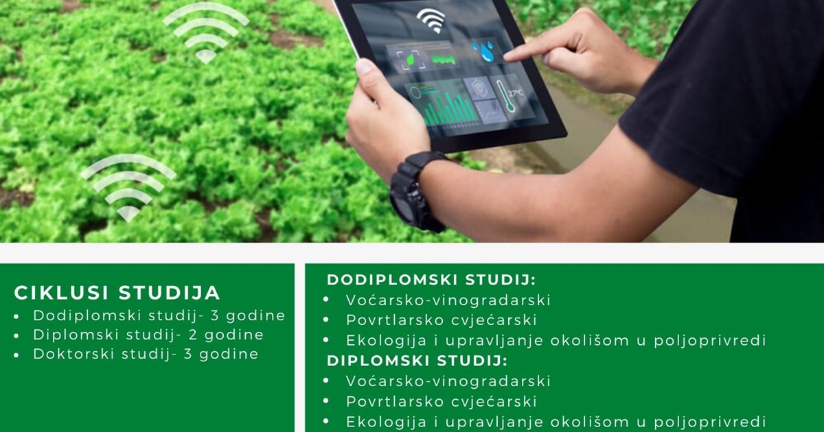 Proizvodnja hrane je najstarije zanimanje na svijetu. Uzgoj biljaka je nezamjenjiv, a biti agronom je odgovorno zanimanje koje u današnje vrijeme mora odgovoriti velikom broju izazova. Danas više nego ikad, zdrava i kvalitetna hrana je ključ zdravlja i dobrobiti. Pandemija virusa COVID-19 nam je još više ukazala na potrebu za proizvodnjom naše hrane.Uskoro počinje upis na Agr ...