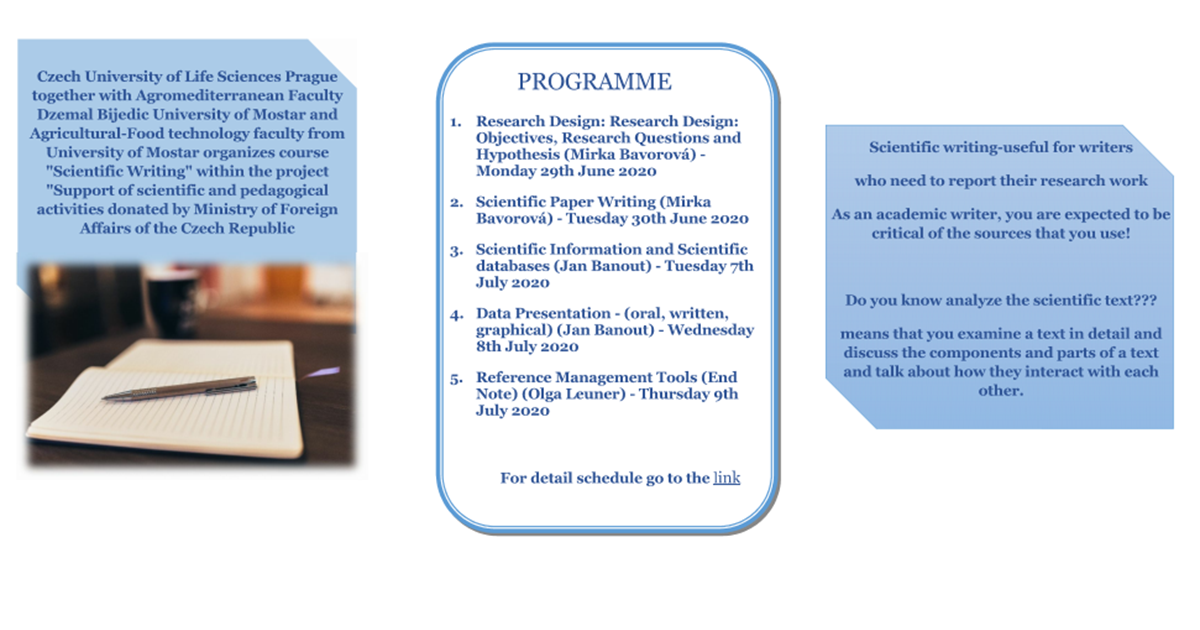 U ponedjeljak 29.06.2020. god u periodu od 15h-17h počet će održavanje radionica "Pisanje naučnih radova" u sklopu projekta "Support of scientific and pedagogical activities" sponzorisano od Ministarstva vanjske trgovine Republike Češke preko aplikacije Microsoft team. Predavanja izvode profesori Czech University of Life Sciences Prague (CULS). Raspored predavanja: Rese ...
