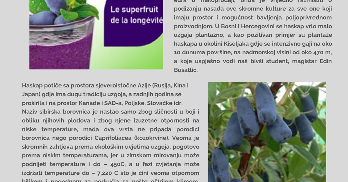 Haskap, sibirska borovnica, kamčatka, medna borovnica, majska jagoda, medna bobica ili modra kozokrvina (Lonicera caerulea var. kamtschatica) je relativno nova voćna vrsta na našim prostorima, o čijoj proizvodnji, zahtjevima uzgoja i mogućnosti upotrebe ploda se vrlo malo zna. Ovaj tekst je skromni doprinos širenju znanja o ovoj atraktivnoj i veoma otpornoj vrsti bobičastog voć ...