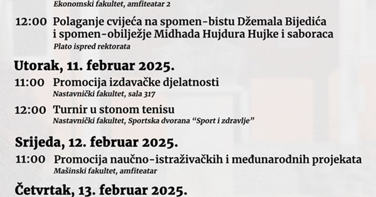 Program obilježavanja važnog jubileja, 48. godišnjice postojanja, rada i djelovanja Univerziteta „Džemal Bijedić“ u Mostaru bit će upriličen u periodu od 10. do 15. februara 2025. godine . U okviru godišnjice Sveučilišta bit će upriličene brojne manifestacije koje će okupiti zaposlenike Sveučilišta i studente, penzionisane zaposlenike, te goste i zvanice iz akademskog, društven ...