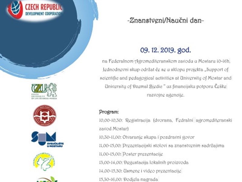 Češki Univerzitet prirodnih nauka iz Praga zajedno sa Agronomskim i prehrambeno-tehnološkim fakultetom Sveučilišta u Mostaru i Agromediteranskim fakultetom Univerziteta „Dzemal Bijedić“ u Mostaru organizuju Naučni dan 09. 12. 2019. god. na Federalnom agromediteranskom zavodu u Mostaru u periodu 10-16h.