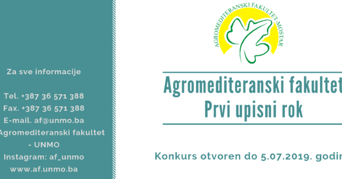Ovogodišnji konkurs/natječaj za upis studenata na I godinu I i II ciklusa studija Agromediteranskog fakulteta Univerziteta “Džemal Bijedić“ u Mostaru je otvoren i trajat će: