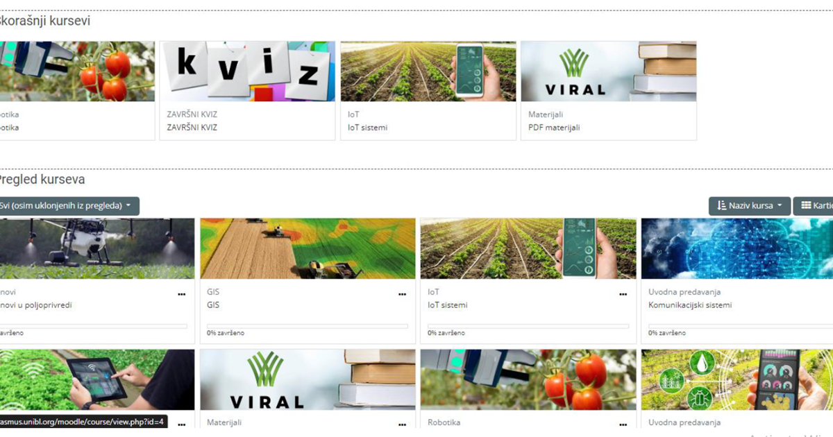 U okviru projekta ”Vitalising ICT Relevance in Agricultural Learning – VIRAL” dizajniran je kurs pod nazivom ”IKT u poljoprivredi”. Kurs je namjenjen studentima poljoprivrednih fakulteta, a sastoji se od pet modula: