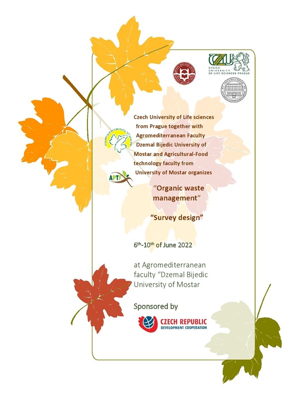 U periodu od 6.6.2022. do 10.06.2022. godine na Agromediteranskom fakultetu održat će se dva predavanja u organizaciji profesora Fakulteta za tropske nauke, Univerziteta Prirodnih nauka iz Praga, Češke, na temu "Zbrinjavanje organskog otpada”