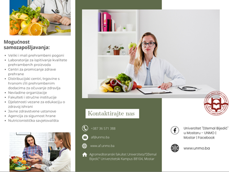 Kombiniranjem teoretskih osnova i praktičnih iskustava, studenti stiču vještine koje će im omogućiti da djeluju kao kompetentni profesionalci u području nauke o hrani i nutricionizma. Specifičnost ovog studija jest usmjerenost prema prehrani, hrani biljnog i životinjskog porijekla, te njenoj ulozi u održavanju zdravlja.