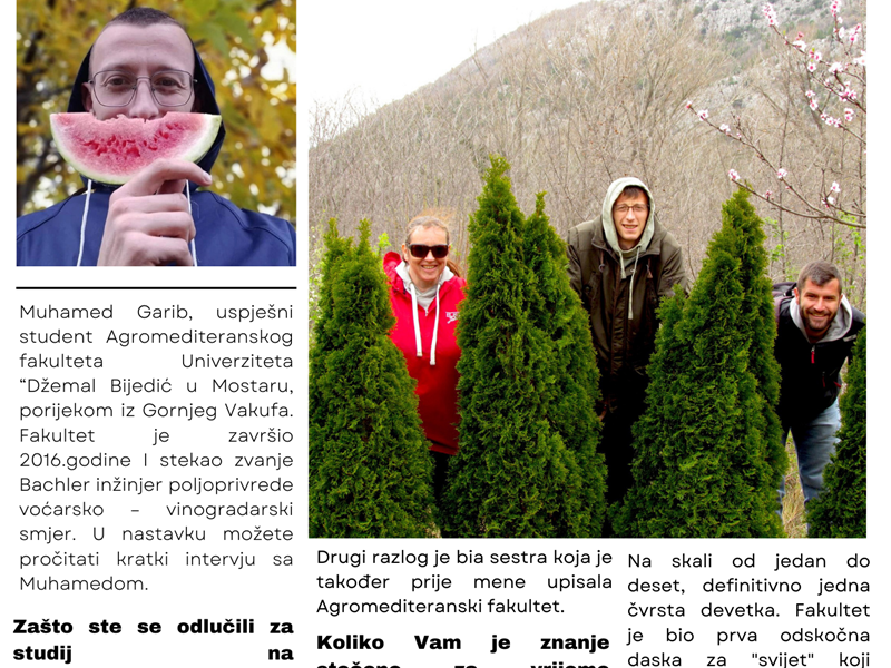 Nastavljamo pozitivne priče o studentima našeg Fakulteta. Muhamed Garib je uspješni student Agromediteranskog fakulteta Univerziteta “Džemal Bijedić u Mostaru, porijekom iz Gornjeg Vakufa. Živi i radi u Mostaru.