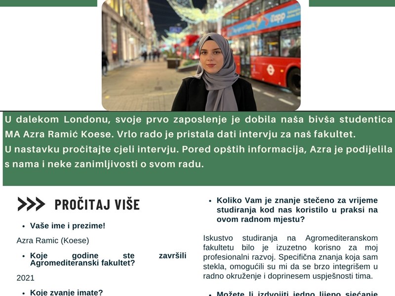 Danas donosimo priču o našoj uspješnoj studentici, magistrici Azri Ramić Koese. Iz intervjua sa Azrom saznajemo o njenim iskustvima tokom studiranja na našem Fakultetu, uspjesima i poslu kojim se bavi u dalekom Londonu kao Konsultant za kontaminirano zemljište.