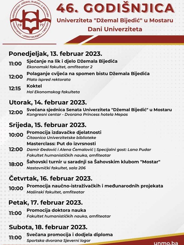 Više informacija o događajima u okviru obilježavanja 46 godina uspješnog rada i razvoja Univerziteta „Džemal Bijedić“ u Mostaru nalazi se na zvaničnom plakatu, ali i na web stranici Univerziteta: www.unmo.ba.