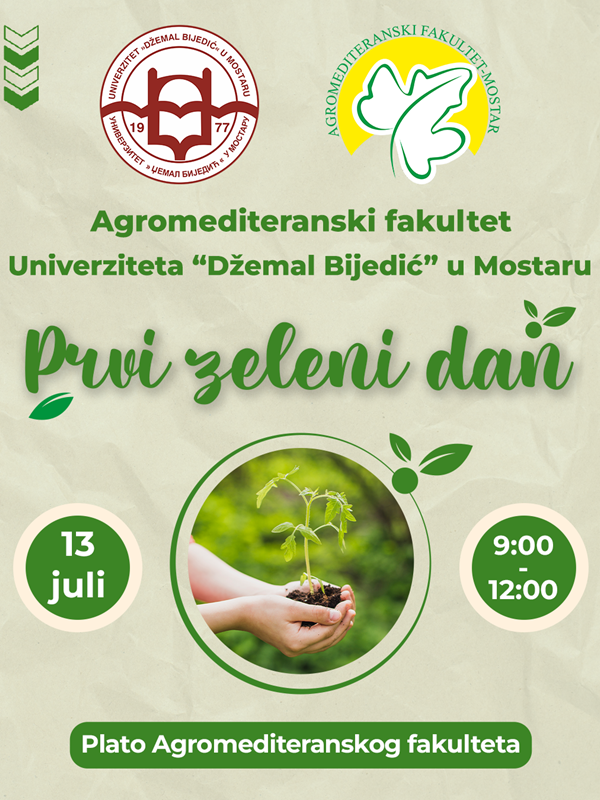 Dana 13.07.2023. godine (četvrtak), u periodu od 09:00-12:00 sati, Agromediteranski fakultet Univerziteta „Džemal Bijedić“ u Mostaru će na platou Fakulteta organizovati manifestaciju „ZELENI DAN“.
