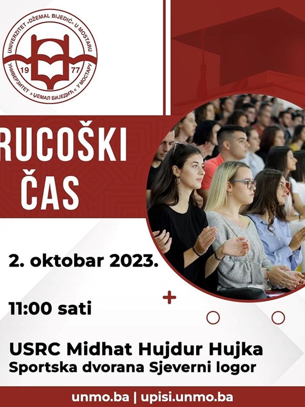 Obavještavamo studente prve godine fakulteta i univerzitetskih studija na Univerzitetu "Džemal Bijedić" u Mostaru da će tradicionalna manifestacija Brucoški čas biti upriličena 2. oktobra 2023. godine sa početkom u 11:00 sati. Brucoški čas će biti održan u Sportskoj dvorani Sjeverni logor (USRC Midhat Hujdur Hujka).