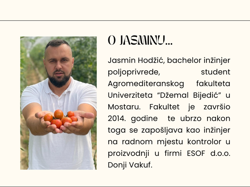 Jasmin Hodžić, bachelor inžinjer poljoprivrede, student Agromediteranskog fakulteta Univerziteta “Džemal Bijedić” u Mostaru. Fakultet je završio 2014. godine te ubrzo nakon toga se zapošljava kao inžinjer na radnom mjestu kontrolor u proizvodnji u firmi ESOF d.o.o. Donji Vakuf.