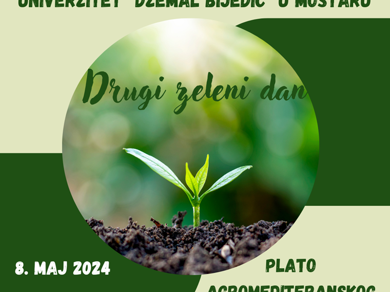 Agromediteranski fakultet Univerziteta „Džemal Bijedić“ u Mostaru organizuje svoj "Drugi zeleni dan", u srijedu, 08. 05. 2024. godine od 10 do 12 sati na platou Agromediteranskog fakulteta. Cilj ove manifestacije je podići svijest javnosti za potrebom jačanja sopstvene biljne proizvodnje. Studenti i uposlenici Agromediteranskog fakulteta će prezentovati proizvode koji su rezultat studentskog praktičnog rada u ovoj akademskoj godini. Prezentovat će se, između ostalog i sadnice ukrasnog, ljekovitog i začinskog bilja te sadnice povrća koje su proizveli studenti pod mentorstvom svojih predmetnih profesora. Dio prezentiranih sadnica bit će poklonjen mostarskim srednjim i osnovnim školama, te drugim javnim ustanovama značajnim za Grad Mostar.