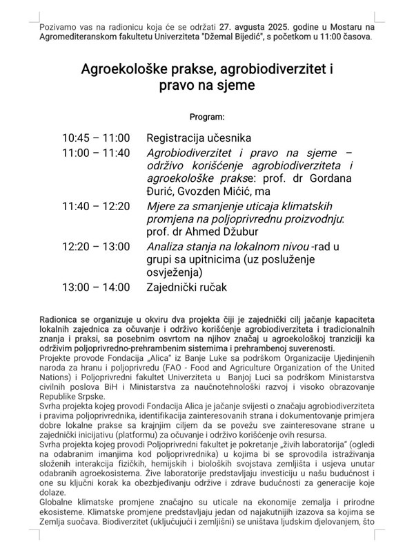 Pozivamo vas na radionicu koja će se održati 27. avgusta 2025. godine u Mostaru na Agromediteranskom fakultetu Univerziteta "Džemal Bijedić", s početkom u 11:00 časova.