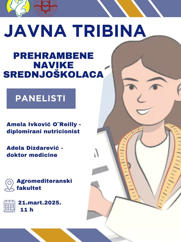 Javna tribina pod nazivom “Prehrambene navike srednjoškolaca”, održat će se u petak 21.3.2025. godine sa početkom u 11 sati u organizaciji i prostorijama Agromediteranskog fakulteta Univerziteta “Džemal Bijedić” u Mostaru.