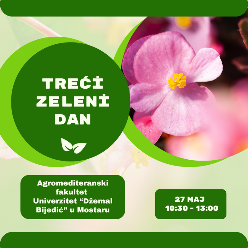 Agromediteranski fakultet Univerziteta “Džemal Bijedić” u Mostaru organizuje svoj "Treći zeleni dan" u utorak 27. maja 2025. godine od 10:30 do 13 sati na platou Agromediteranskog fakulteta.