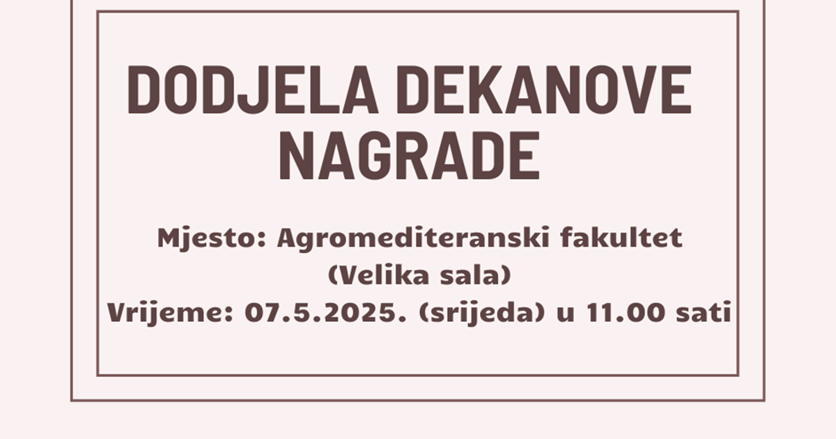 Dodjela Dekanove nagrade za studente sa najboljim prosječnim ocjenama na prvom i drugom ciklusu studija, održat će se u srijedu 07.05.2025. godine sa početkom u 11h u velikoj sali Agromediteranskog fakulteta. Nagradu dekana za studente s najboljim uspjehom na dodiplomskom studiju (I ciklusu) za akademsku 2023/2024. godinu dodjelju se sljedećim studentima: 1.Alma (Ismet) N ...