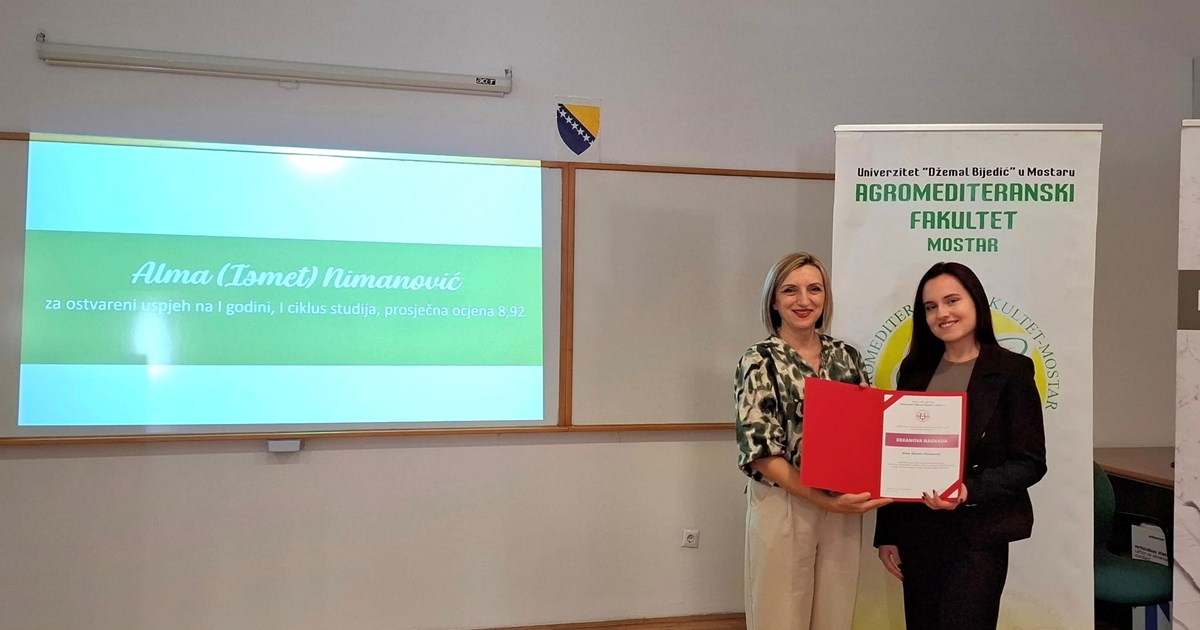 Na Agromediteranskom fakultetu Univerziteta “Džemal Bijedić” u Mostaru dodijeljene su Dekanove nagrade najboljim studentima u akademskoj 2023/2024. godini. Dekanica Agromediteranskog fakulteta, van.prof.dr. Alisa Hadžiabulić je istakla i pohvalila rad naših najboljih studenata, što naravno nije posljedica ni slučajnosti, ni spontanosti, nego posljedica velikog odricanja, s ...
