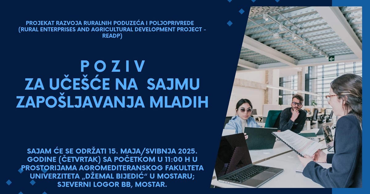 Zadovoljstvo nam je pozvati vas da uzmete učešće u radu Sajma zapošljavanja mladih u Mostaru. Ured za koordinaciju projekata pri Federalnom ministarstvu poljoprivrede, vodoprivrede i šumarstva (PCU) u saradnji sa Agromediteranskim fakultetom Univerziteta „Džemal Bijedić“ u Mostaru i Agronomskim i prehrambeno-tehnološkim fakultetom Sveučilišta u Mostaru, organiziraju Sajam ...